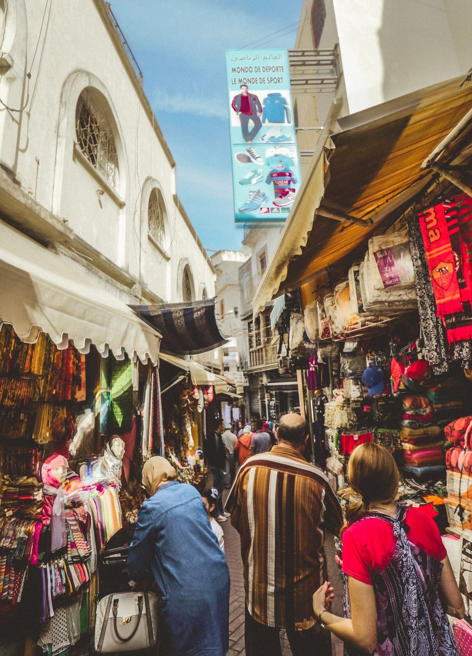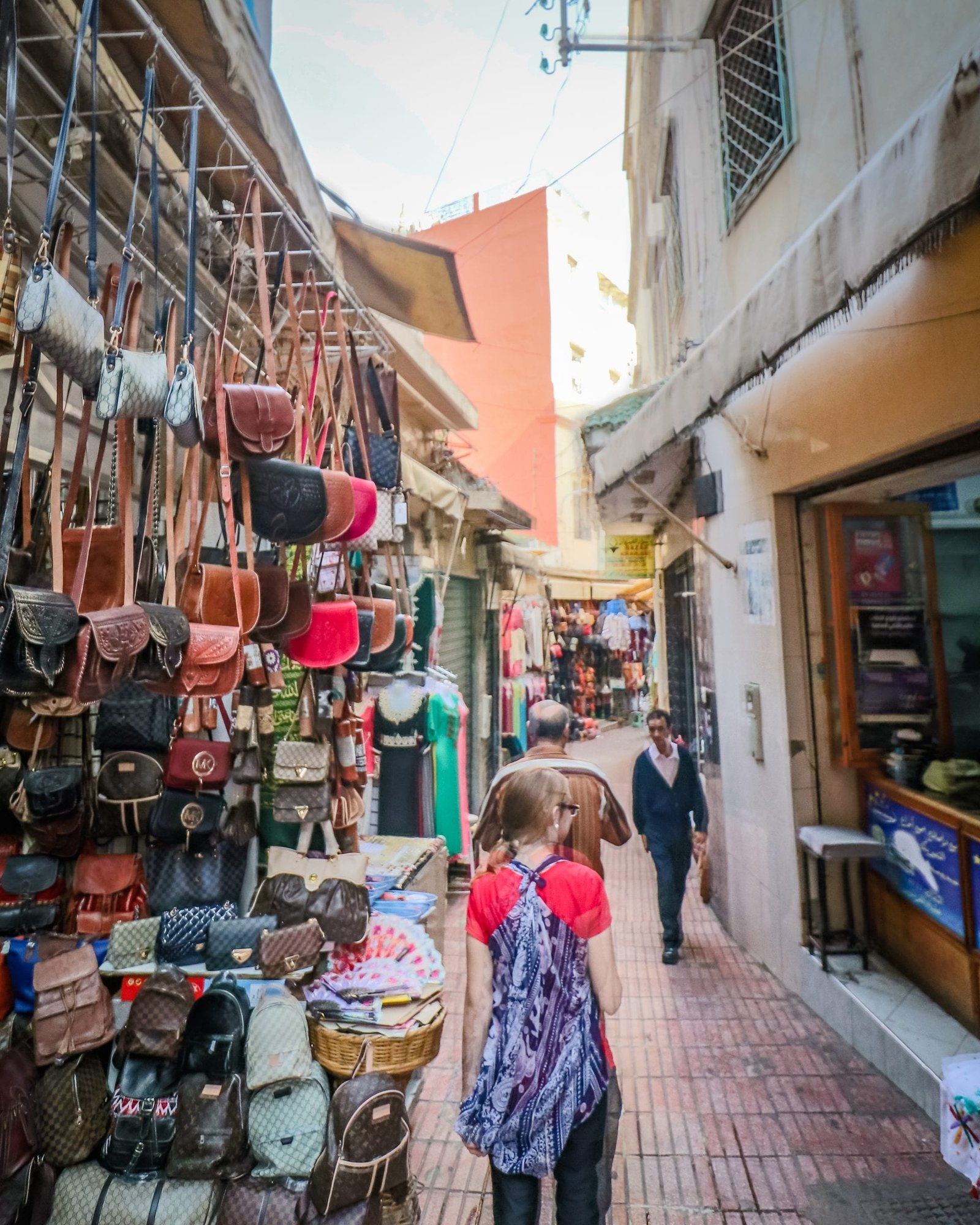 Lisa following our guide past some street vendors in Tangier Morocco