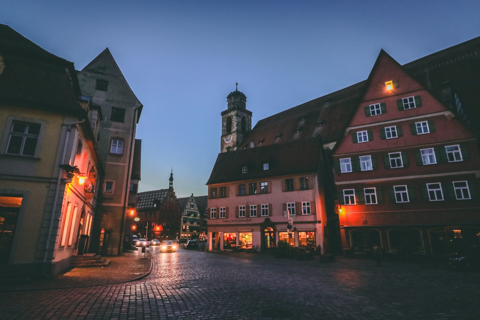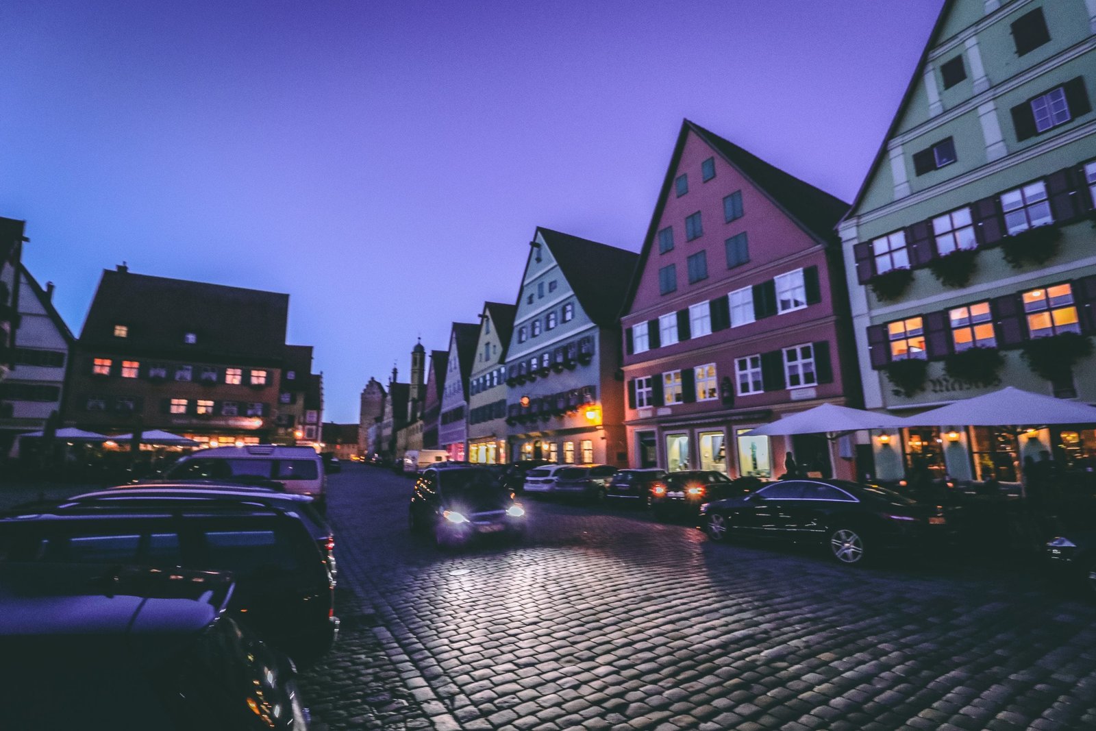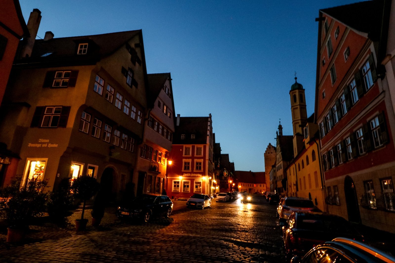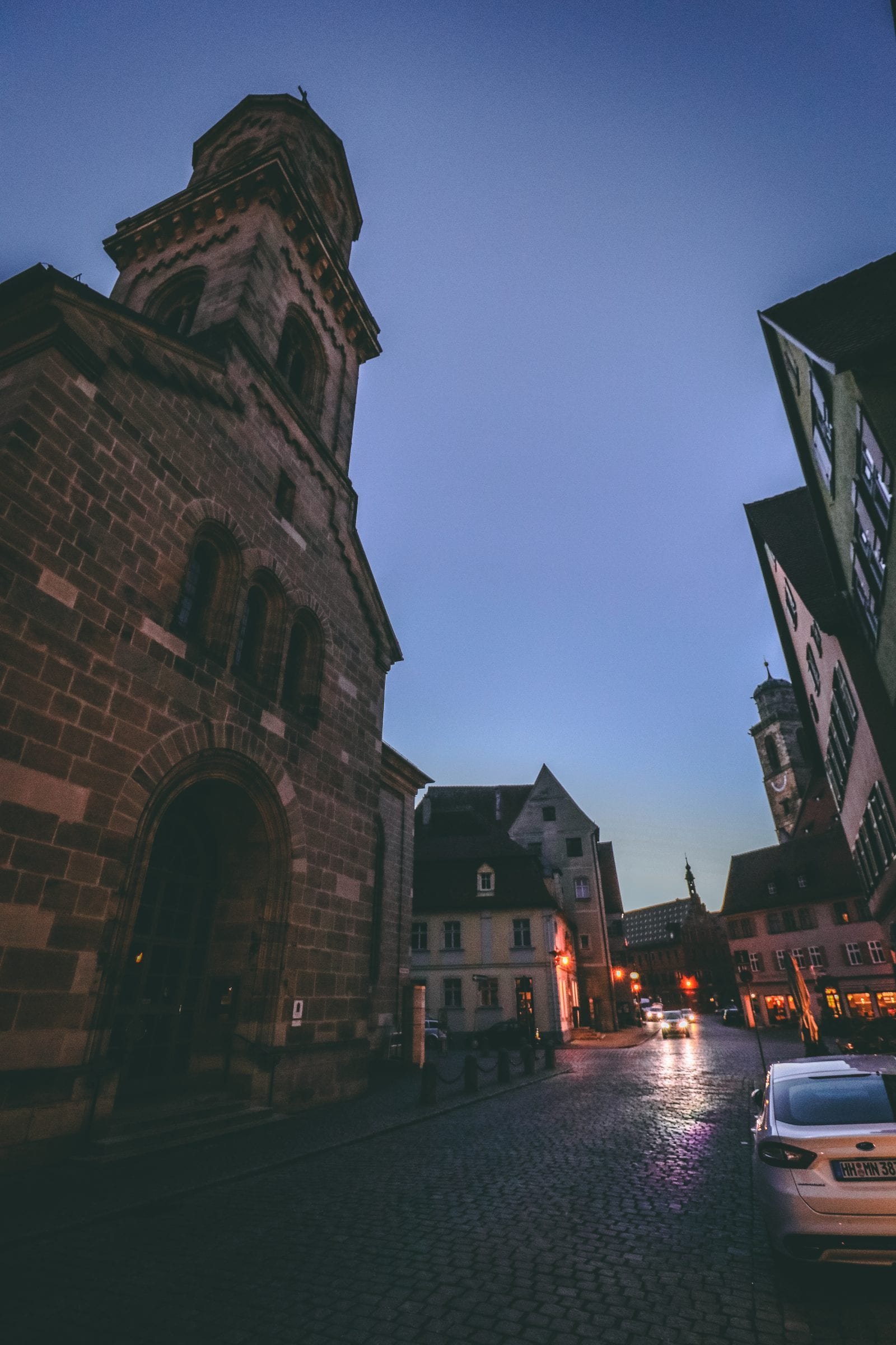 Car headlights reflecting off of cobblestone streets in Dinkelsbühl Germany