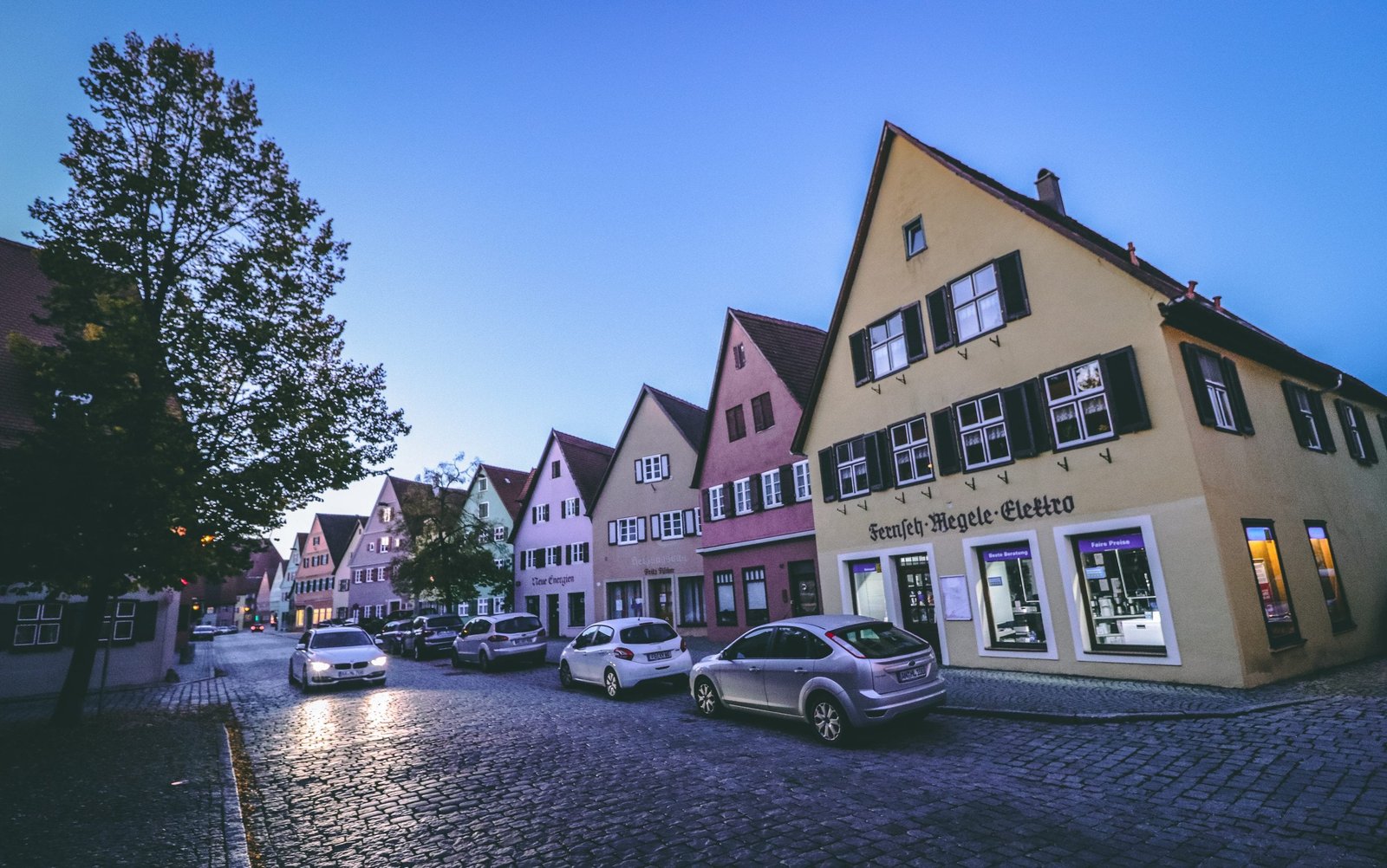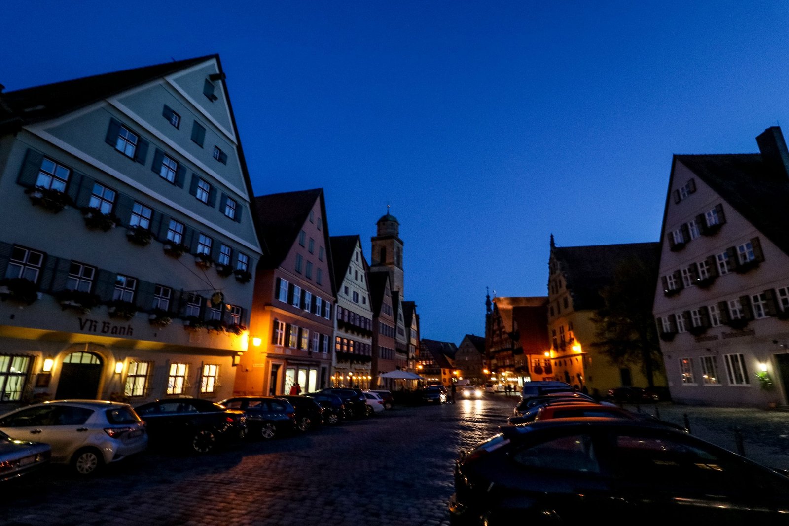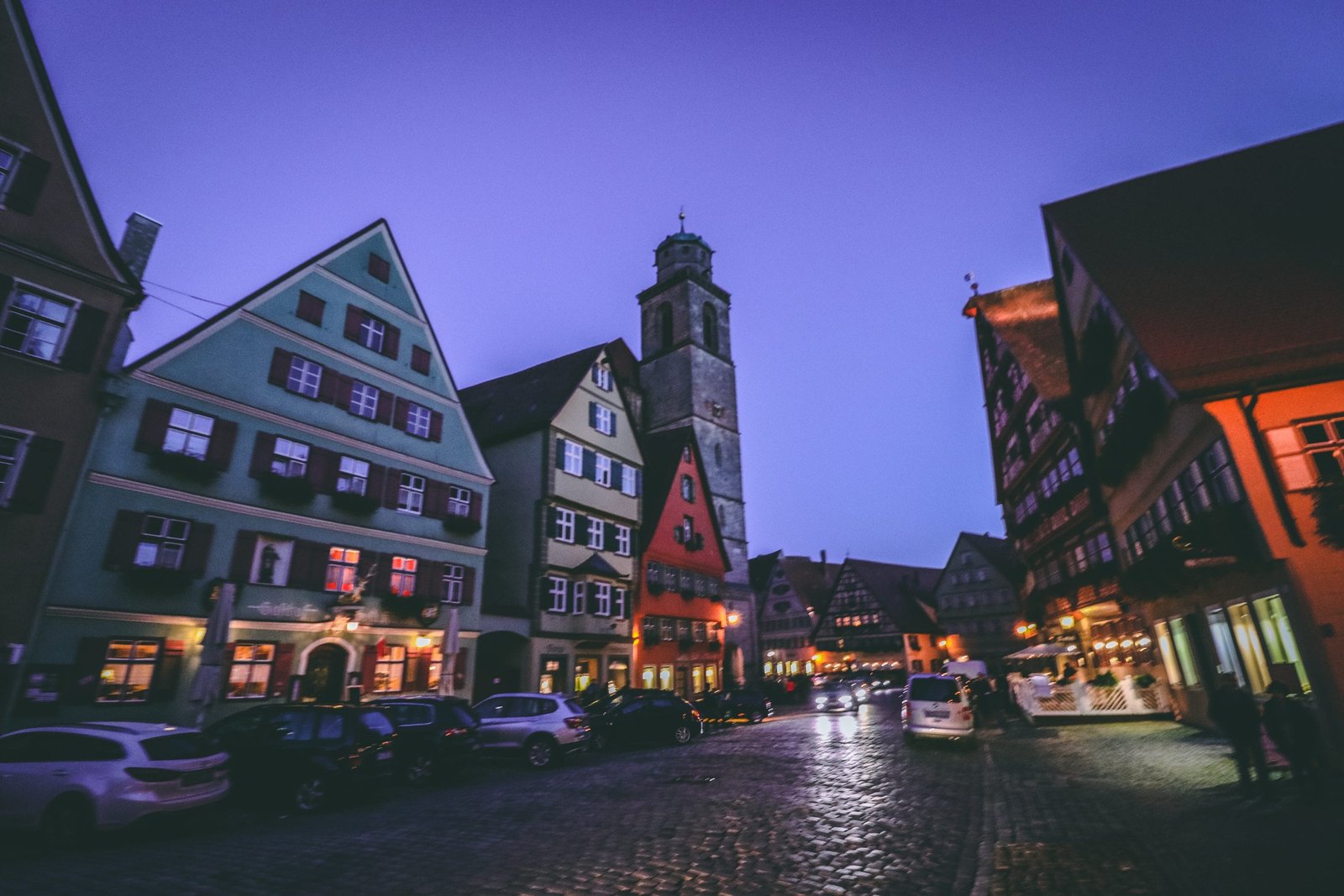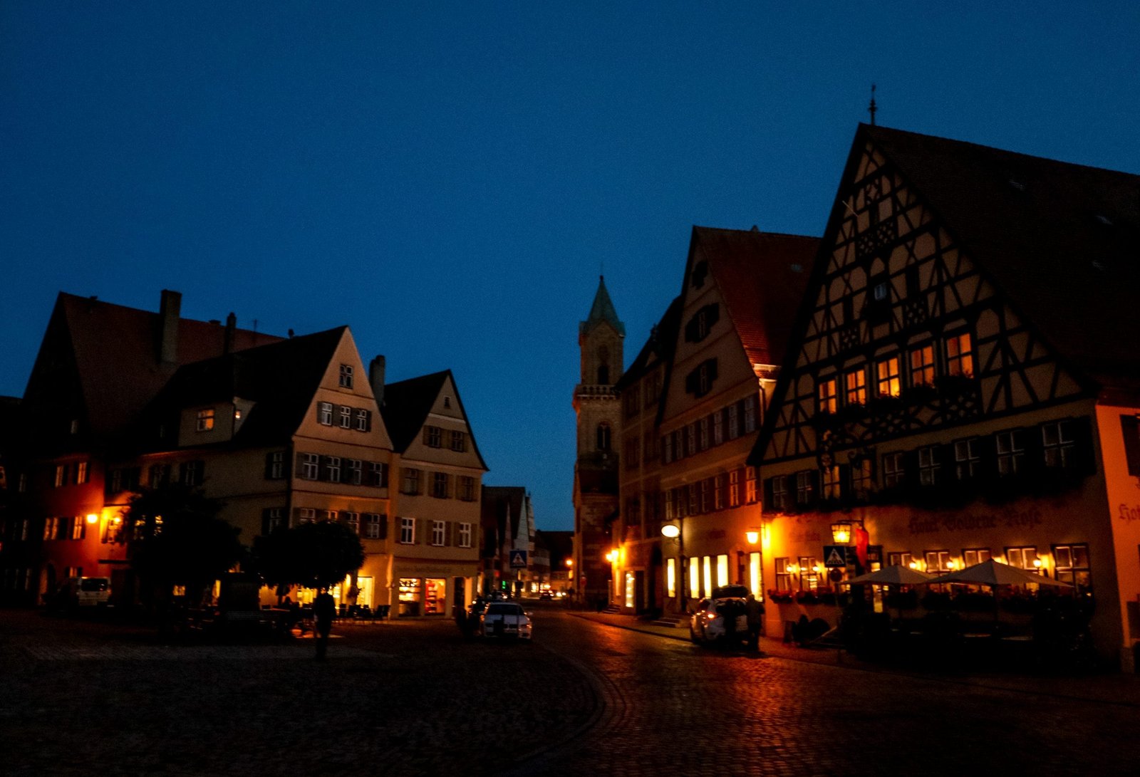 Car headlights reflecting off of cobblestone streets in Dinkelsbühl Germany
